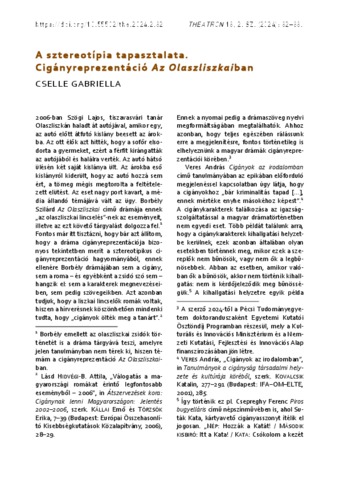 Cselle, Gabriella (2024) A sztereotípia tapasztalata. Cigányreprezentáció Az Olaszliszkaiban. THEATRON: SZÍNHÁZTUDOMÁNYI PERIODIKA, 18 (2). pp. 82-88. ISSN 1418-9941