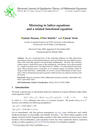 Hesoun, Jakub and Stehlík, Petr and Volek, Jonas (2024) Mirroring in lattice equations and a related functional equation. Electronic Journal of Qualitative Theory of Differential Equations, 2024 (65). pp. 1-21. ISSN 1417-3875