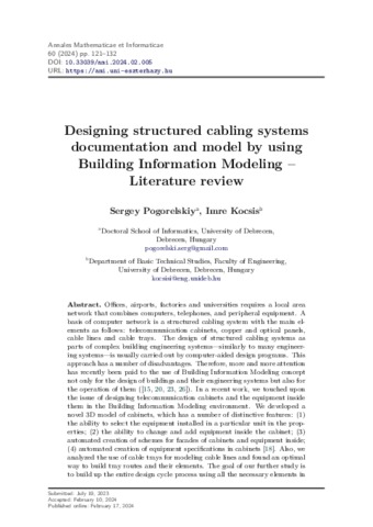 Pogorelskiy, Sergey and Kocsis, Imre (2024) Designing structured cabling systems documentation and model by using Building Information Modeling – Literature review. ANNALES MATHEMATICAE ET INFORMATICAE, 60. pp. 121-132. ISSN 1787-6117