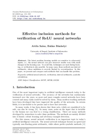 Szász, Attila and Bánhelyi, Balázs (2024) Effective inclusion methods for verification of ReLU neural networks. ANNALES MATHEMATICAE ET INFORMATICAE, 60. pp. 141-150. ISSN 1787-6117