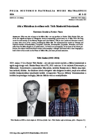 Kenyeres, Zoltán and Kovács, Tibor (2024) Aki a Mátrában is otthon volt: Tóth Sándortól búcsúzunk = Who was also at home in the Mátra Mts – we say goodbye to Sándor Tóth. FOLIA HISTORICO-NATURALIA MUSEI MATRAENSIS, 48. pp. 5-12. ISSN 01341243