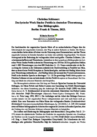 Kovács, Kálmán (2024) Christina Schlosser: Das lyrische Werk Sándor Petőfis in deutscher Übersetzung. Eine Bibliographie. Berlin: Frank & Timme, 2023. JAHRBUCH DER UNGARISCHEN GERMANISTIK, 2023. pp. 165-166. ISSN 1217-0216