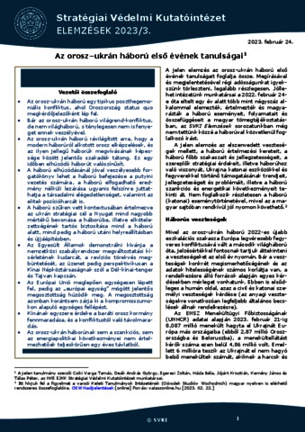 A jelen elemzés az orosz-ukrán háború első évének tanulságait foglalja össze. Megírásával és megjelentetésével régi adósságunkat igyekszünk törleszteni, legalább részlegesen. Jóllehet intézetünk munkatársai a 2022. február 24-e óta eltelt egy év alatt több mint négyszáz alkalommal elemezték, értelmezték és magyarázták a háború eseményeit, folyamatait és összefüggéseit a magyar tömegtájékoztatásban, az SVKI Elemzések sorozatunkban még nem tettünk közzé a háborúval közvetlenül foglalkozó írást. A jelen elemzés az elszenvedett veszteségek mellett, a háború értelmezési kereteit, a háború főbb szakaszait és jellegzetességeit, a szereplők stratégiai érdekeit, illetve háborúhoz való viszonyát, Ukrajna katonai eszközökkel és fegyverekkel történő támogatásának trendjeit, jellegzetességeit és problémáit, illetve a háború szankciós és energetikai következményeit tekinti át. Nem foglalkozik részletesen a háború (katonai) eseménytörténetével, mivel az a magyar sajtóban rendkívül jól nyomon követhető.