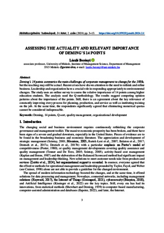 Deming’s 14 points summarize the main challenges of corporate management to change for the 1980s, but the teaching may still be actual. Recent crises have drawn attention to the need to rethink and refine business. Leadership and organization have a crucial role in responding appropriately to environmental changes. The study uses an online survey to assess the relative importance of 14 points among higher education students. The analysis used the Q-methodology. The results suggest competing opinion patterns about the importance of the points. Still, there is an agreement about the key relevance of constantly improving every process for planning, production, and service as well as instituting training on the job. At the same time, the respondents significantly agreed that eliminating numerical quotas cannot be considered indispensable.