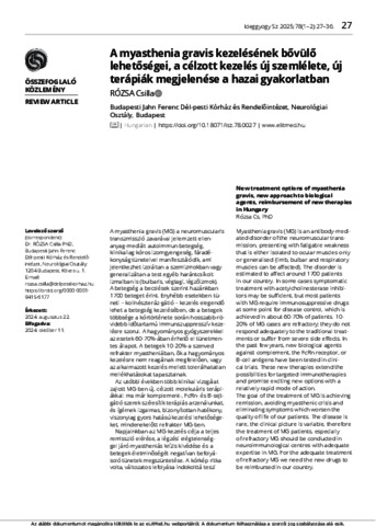 Rózsa, Csilla (2025) A myasthenia gravis kezelésének bővülő lehetőségei, a célzott kezelés új szemlélete, új terápiák megjelenése a hazai gyakorlatban. IDEGGYOGYASZATI SZEMLE / CLINICAL NEUROSCIENCE, 78 (1-2). pp. 27-36. ISSN 0019-1442