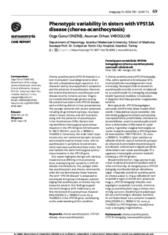 Oner, Ozge Gonul and Varoglu, Asuman Orhan (2025) Phenotypic variability in sisters with VPS13A disease (chorea-acanthocytosis) = Fenotípusos variabilitás VPS13A betegségben (chorea-acanthocytosis) szenvedő nővéreknél. IDEGGYOGYASZATI SZEMLE / CLINICAL NEUROSCIENCE, 78 (1-2). pp. 69-72. ISSN 0019-1442