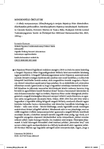 Ludmán, Katalin (2024) Mindenféle őrületek : A téboly menyasszonya: (Elme)betegség és terápia Hajnóczy Péter életművében. Elzárhatatlan párbeszédben. Interdiszciplináris Hajnóczy-tanulmányok. Szerkesztette: Cserjés Katalin, Hoványi Márton és Varga Réka. Budapest: Eötvös Loránd Tudományegyetem Tanítóés Óvóképző Kar–MűGond Hermeneutikai Kör, 2023. LITERATURA, 50 (4). pp. 416-422. ISSN 0133-2368