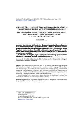 A nyelvközi fordítás kutatásához alkalmazott terminológiai keretrendszer alapján eredményesen vizsgálhatók a nyelven belüli fordítás jellemzői is. A honosítás és az idegenítés terminusokkal jelölt két alapvető fordítási stratégia is ebbe a keretrendszerbe tartozik. Vizsgálatuk lehetővé teszi a nyelven belüli fordítás sajátosságainak a pontosabb leírását, a nyelvek közötti fordítási folyamatra jellemző ismérvek feltárását és egyes fordítói döntések megalapozottabb indoklását. Az alábbiakban azt vizsgálom, vajon mely tényezők határozzák meg a nyelven belüli fordító döntéseit a honosítás és idegenítés dichotómiájának területén. | The terminological framework used for the study of interlingual translation can also be used to investigate the characteristics of translation within a language. The two basic translation strategies, denoted by the terms domesticating and foreignising, fall within this framework. Examining them will allow a more precise description of the characteristics of intralingual translation, the identification of features specific to the interlingual translation process and a better justification of certain translation decisions. In the following, I will examine which factors determine the intralingual translator’s decisions in the dichotomy of domesticating and foreignising.