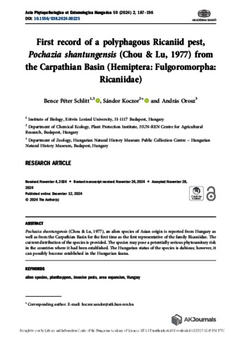 Schlitt, Bence Péter and Koczor, Sándor and Orosz, András (2024) First record of a polyphagous Ricaniid pest, Pochazia shantungensis (Chou & Lu, 1977) from the Carpathian Basin (Hemiptera: Fulgoromorpha: Ricaniidae). ACTA PHYTOPATHOLOGICA ET ENTOMOLOGICA HUNGARICA, 59 (2). pp. 187-196. ISSN 0238-1249
