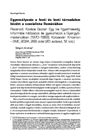Sólyom, Andrea (2025) Egyensúlyozás a fenti és lenti társadalom között a szocialista Romániában: Recenzió: Kovács Eszter: Egy kis figyelmesség. Informális hálózatok és gyakorlatok a Gyergyói-medencében (1970–1989). Kolozsvár: Kriterion – EME, 2024, 266 oldal [20. század, 12. köt.]. SZOCIOLÓGIAI SZEMLE, 35 (2). pp. 2-8. ISSN 1216-2051