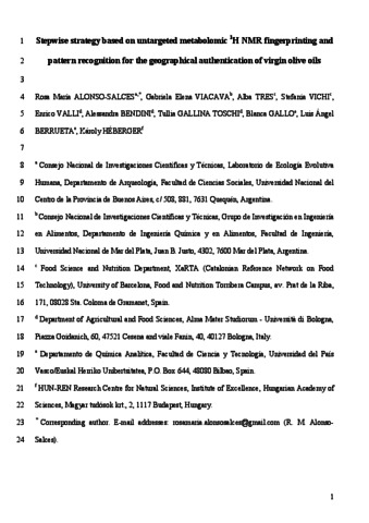 Alonso-Salces, Rosa María and Viacava, Gabriela Elena and Tres, Alba and Vichi, Stefania and Valli, Enrico and Bendini, Alessandra and Gallina Toschi, Tullia and Gallo, Blanca and Berrueta, Luis Ángel and Héberger, Károly (2025) Stepwise strategy based on untargeted metabolomic 1H NMR fingerprinting and pattern recognition for the geographical authentication of virgin olive oils. FOOD CONTROL, 173. No.-111216. ISSN 0956-7135