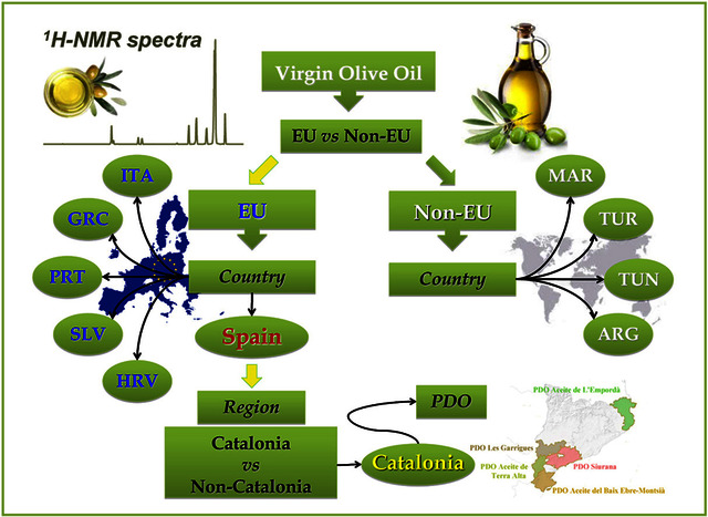 1H NMR fingerprinting of virgin olive oils (VOOs) and a collection of binary classification models arranged in a decision tree are presented as a stepwise strategy to determine the geographical origin of a VOO at four levels, i.e. provenance from an EU member state or outside the EU, country and region of origin, and compliance with a geographical indication scheme. This approach supports current EU regulation that makes labelling of the geographical origin mandatory for olive oil. Currently, official methods for its control are still lacking. Partial least squares discriminant analysis (PLS-DA) and random forest for classification afforded robust and stable binary classification models to verify the geographical origin of VOOs; however, the former outperformed the latter in terms of accuracy and robustness. The prediction abilities of the best binary PLS-DA model for each case study were between 80% and 100% for both classes in cross-validation and in external validation. The satisfactory results achieved for the verification of the geographical origin of VOOs, together with those of our previous studies on the discrimination of olive oil categories, the detection of olive oils blended with vegetable oils (Alonso-Salces et al., 2022), and the determination of the stability, freshness, storage time and conditions, and olive oil best−before date (Alonso-Salces et al., 2021), confirm that a single 1H NMR analysis of an olive oil sample can provide useful information to control several EU regulations related to olive oil marketing standards (Regulation (EU) 2022/2104 and Regulation (EU) 2024/1143).