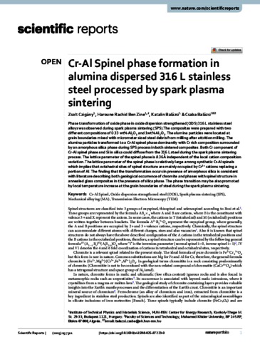 Czigány, Zsolt and Ben Zine, Haroune Rachid and Balázsi, Katalin and Balázsi, Csaba (2025) Cr-Al Spinel phase formation in alumina dispersed 316 L stainless steel processed by spark plasma sintering. SCIENTIFIC REPORTS, 15 (1). ISSN 2045-2322