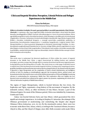 This article aims to understand the historical significance of Cilicia within the context of imperial dynamics in the Middle East. Cilicia, a region characterized by shifting borders and contested sovereignty, provides a unique lens through which to examine the interactions between imperial powers, local populations and the lasting effects of conflict. The study draws on a wide range of scholarly sources to explore how Cilicia has been perceived amidst imperial rivalries, focusing on the competing narratives, geopolitical ambitions and humanitarian interventions that have shaped its history. Key themes include the impact of genocide in Upper Mesopotamia and the complexities of French colonial administration and intelligence activities in Syria. By adopting an interdisciplinary approach that incorporates history, political science and humanitarian studies, this research aims to unravel the multifaceted perception of Cilicia and highlight its enduring relevance in understanding the contemporary Middle East. This examination offers new insights into how historical events and policies have influenced the region’s present-day dynamics, emphasizing the critical role of Cilicia in the broader complexity of Middle Eastern history. | A tanulmány célja, hogy megértsük Kilikia történelmi jelentőségét a közel-keleti birodalmi dinamika összefüggésében. Kilikiát a határok változékonysága és a vitatott szuverenitás jellemzi, illetve egyedülálló perspektívát nyújt a birodalmi hatalmak, a helyi lakosság és a konfliktusok tartós hatásainak vizsgálatához. A kutatás a tudományos források sokrétűségére támaszkodik, hogy feltárja, hogyan látták Kilikiát a birodalmi rivalizálások közepette, a versengő narratívákra, geopolitikai ambíciókra és humanitárius beavatkozásokra összpontosítva. A tanulmány hangsúlyozza a népirtás hatását FelsőMezopotámiában és a francia gyarmati közigazgatás és hírszerzés összetettségét Szíriában. Az interdiszciplináris megközelítésnek köszönhetően ez a kutatás rávilágít Kilikia sokrétű megítélésére és tartós jelentőségére a kortárs Közel-Kelet megértésében. Új betekintést nyújt azokba a történelmi eseményekbe és politikákba, amelyek befolyásolták a régió mai dinamikáját, kiemelve Kilikia kritikus szerepét a közelkeleti történelem szövevényében.