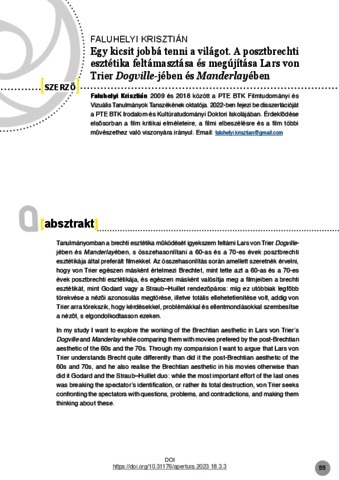 Tanulmányomban a brechti esztétika működését igyekszem feltárni Lars von Trier Dogvillejében és Manderlayében, s összehasonlítani a 60-as és a 70-es évek posztbrechti esztétikája által preferált filmekkel. Az összehasonlítás során amellett szeretnék érvelni, hogy von Trier egészen másként értelmezi Brechtet, mint tette azt a 60-as és a 70-es évek posztbrechti esztétikája, és egészen másként valósítja meg a filmjeiben a brechti esztétikát, mint Godard vagy a Straub–Huillet rendezőpáros: míg ez utóbbiak legfőbb törekvése a nézői azonosulás megtörése, illetve totális ellehetetlenítése volt, addig von Trier arra törekszik, hogy kérdésekkel, problémákkal és ellentmondásokkal szembesítse a nézőt, s elgondolkodtasson ezeken. | In my study I want to explore the working of the Brechtian aesthetic in Lars von Trier’s Dogville and Manderlay while comparing them with movies prefered by the post-Brechtian aesthetic of the 60s and the 70s. Through my comparision I want to argue that Lars von Trier understands Brecht quite differently than did it the post-Brechtian aesthetic of the 60s and 70s, and he also realise the Brechtian aesthetic in his movies otherwise than did it Godard and the Straub–Huillet duo: while the most important effort of the last ones was breaking the spectator’s identification, or rather its total destruction, von Trier seeks confronting the spectators with questions, problems, and contradictions, and making them thinking about these.