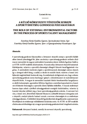 A sporttehetség-gondozás folyamatában a környezeti tényezők szerepe a sportolók fejlődé sében kiemelt jelentőséggel bír. Jelen tanulmány a sporttehetség-gondozás területén alkal mazott nemzetközi és magyar szakirodalmi kutatásokat elemzi, különös figyelmet fordítva az ATDE- és ESF-modellek alkalmazására. A kutatás célja a környezeti tényezők hatásainak feltérképezése, valamint a sportolók sikerességét elősegítő faktorok összefüggéseinek vizs gálata. A szakirodalmi áttekintés alapján a sportkörnyezetek sikerességét számos tényező, így a támogató edzői közeg, a család, az iskolai és szociális háttér, valamint a hosszú távú fejlesztési megközelítések határozzák meg. Az eredmények rávilágítanak arra, hogy a sikeres sporttehetség-gondozás szoros összhangot igényel a mikrokörnyezeti és makrokörnyezeti tényezők között. A magyar és nemzetközi kutatások közötti összehasonlítás hangsúlyozza az edzők kulcsszerepét, ugyanakkor felhívja a figyelmet a személyes kapcsolatok és a hosszú távú felkészítés fontosságára a sportolók sikeres fejlődése érdekében. A kutatás eredményei hasznos alapot adnak a jövőbeli tehetséggondozási stratégiák kialakításához, valamint új kutatási irányokat jelölnek meg a hazai sporttehetség-gondozás számára. A szervezeti kul túra, a hosszú távú, diverzifikált fejlesztés fókusza és a szélesebb környezet támogatása azok a tényezők, amelyek jelentős hatással vannak a szervezet sikerességére és az eredményes tehetséggondozásra. A különböző tényezők figyelembevétele elengedhetetlen a sportszervezet filozófiájának és mindennapi működésének kialakítása során. Az ATDE- és ESF-modellek alkalmazása sok lehetőséget rejt a magyar sporttehetség-gondozást érintő vizsgálatok számára. | The role of environmental factors in the process of sports talent management in the development of athletes is of particular importance. The present study analyses the international and Hungarian literature in the field of sport talent management, with a special focus on the application of the ATDE and ESF models. The aim of the research is to explore the effects of environmental factors and to investigate the interrelationships between factors that contribute to the success of athletes. Based on the literature review, the success of sport environments is determined by a number of factors, such as a supportive coaching environment, family, school and social background, and long-term development approaches. The results highlight that successful sport talent management requires a close alignment between micro-environmental and macro-environmental factors. The comparison between Hungarian and international research emphasizes the key role of coaches, while highlighting the importance of personal relationships and long-term coaching for the successful development of athletes. The results of the research provide a useful basis for the development of future talent management strategies and identify new research directions for domestic sport talent management. Organizational culture, a focus on long-term, diversified development and support from the wider environment are factors that have a significant impact on organizational success and effective talent management. Consideration of these different factors is essential in shaping the philosophy and day-to-day operations of a sport organization. The application of the ATDE and ESF models has many potentials for studies on sport talent management in Hungary