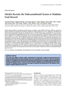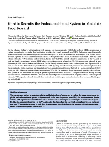 Edwards, Alexander and DeSante, Stephanie and Spencer, Carl Duncan and Hyland, Lindsay and Smith, Andrea and Sankhe, Aditi S. and Stiftné Szilvásy-Szabó, Anett and Fekete, Csaba and Hill, Matthew N. and Chee, Melissa J. and Abizaid, Alfonso (2025) Ghrelin recruits the endocannabinoid system to modulate food reward. JOURNAL OF NEUROSCIENCE, 45 (9). No.-1620242024. ISSN 0270-6474
