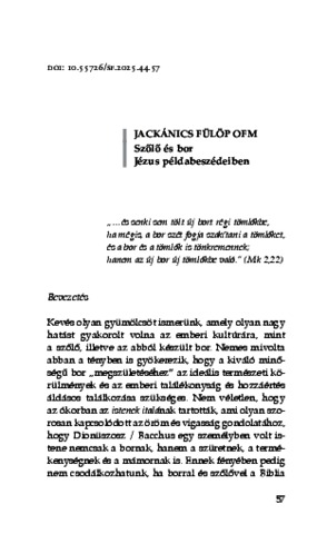 Jackánics, Fülöp (2025) Szőlő és bor Jézus példabeszédeiben. In: A bor "ízei" : A teológiában, filozófiában, életünkben. Sapientia Füzetek (44). L'Harmattan Kiadó - Sapientia Szerzetesi Hittudományi Főiskola, Budapest, pp. 57-80. ISBN 978-615-6277-15-2