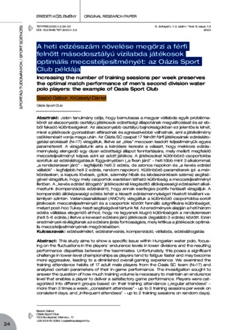 Jelen tanulmány célja, hogy bemutassa a magyar vízilabda egyik problémakörét az alacsonyabb osztályú játékosok edzettségi állapotának megváltozását és az ebből fakadó különbségeket. Az alacsonyabb osztályú bajnokságokban ez jelentős is lehet, mivel a játékosok gyorsabban elfáradnak és agresszívebbé válhatnak, ami a játékélmény csökkenését vonja maga után. Az Oázis SC csapat 17 felnőtt férfi játékosának edzéslátogatási szokásait (N=17) vizsgáltuk, illetve az „éles” meccsen leadott teljesítményük egyes paramétereit. A vizsgálatunk arra a kérdésre kereste a választ, hogy mekkora edzésmennyiség elengedő egy olyan edzettségi állapot fenntartására, mely mellett megfelelő meccsteljesítményt képes adni az adott játékos. A játékosokat különböző csoportokba soroltuk az edzéslátogatásuk függvényében („a fixen járó” – heti több mint 3 alkalommal; „a rendszeresen járó” – legfeljebb heti 3 edzés, de azonos napokon és „a kevés edzést vállalók” - legfeljebb heti 2 edzés, random napokon). Különböző paraméterek (pl. a mérkőzéseken, a kapura lövések, gólok, személyi hibák és labdaszerzések száma) segítségével vizsgáltuk, hogy mely csoportok esetében látható különbség a meccsteljesítményt illetően. A „kevés edzést látogató” játékosoknál kiegészítő állóképességi edzéseket alkalmaztunk (kompenzációs edzésként), hogy annak esetleges pozitív hatásait vizsgáljuk. A kompenzáló állóképességi edzés tehát a kiesett edzésmennyiséget hivatott kiváltani valamilyen szinten. Varianciaanalízissel (ANOVA) vizsgáltuk a különböző csoportokba sorolt játékosok meccsteljesítményét és a csoportok között fennálló szignifikáns különbséget, melyet post-hoc Tukey-teszt segítségével tártunk fel. Az eredmények alapján a heti három edzés vállalása elegendő ahhoz, hogy ne legyenek kiugró különbségek a rendszeresen (heti 5-6 edzés,) illetve a keveset edzésre járó játékosok (legalább 3 edzés) között. Ezen eredmények rávilágítanak az edzésre járás fontosságára, mely kritikus a játékosok optimális meccsteljesítményének megőrzésében. | This study aims to show a specific issue within Hungarian water polo, focusing on the fluctuations in the players’ endurance levels in lower divisions and the resulting performance disparities between the teammates. Unfortunately, this poses a significant challenge in lower-level championships as players tend to fatigue faster and may become more aggressive, leading to a diminished overall gaming experience. We examined the training attendance habits of 17 adult male players from the Oasis SC team (N=17) and analyzed certain parameters of their in-game performance. The investigation sought to answer the question of how much training volume is necessary to maintain an endurance level that enables a player to deliver a satisfactory game performance. Players were categorized into different groups based on their training attendance („regular attendees” – more than 3 times a week; „consistent attendees” – up to 3 training sessions per week on consistent days, and „infrequent attendees” – up to 2 training sessions on random days). Subsequently, we utilized various performance indicators (shots on goal, goals, personal fouls, and steals per game) to explore differences in game performance among these groups. For players attending fewer training sessions, supplementary endurance training was implemented (as compensatory training) to examine potential positive effects. Following data collection, we supplemented our findings with game statistics and employed Analysis of Variance (ANOVA) to examine performance differences among the categorized groups. Significant differences between groups were further revealed using posthoc Tukey test. These results highlight the importance of training attendance, which is critical in maintaining optimal match performance for players.