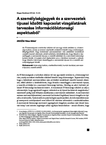 Erdősi, Péter Máté (2016) A személyiségjegyek és a szervezetek típusai közötti kapcsolat vizsgálatának tervezése információbiztonsági aspektusból. MAGYAR RENDÉSZET, 16 (6). pp. 13-23. ISSN 1586-2895 (nyomtatott); 1787-050X (elektronikus)