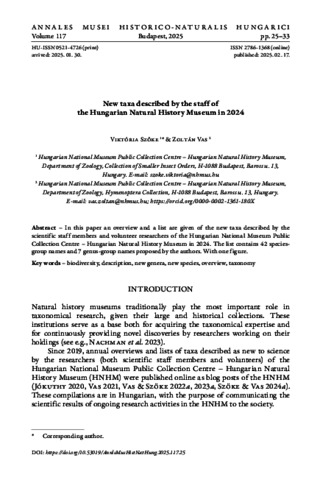 Szőke, Viktória and Vas, Zoltán (2025) New taxa described by the staff of the Hungarian Natural History Museum in 2024. ANNALES MUSEI HISTORICO-NATURALIS HUNGARICI, 117. pp. 25-33. ISSN 0521-4726