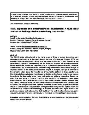 Szabó, Linda and Jelinek, Csaba (2023) State, capitalism and infrastructure-led development: A multi-scalar analysis of the Belgrade-Budapest railway construction. ENVIRONMENT AND PLANNING A, 55 (5). pp. 1281-1304. ISSN 0308-518X