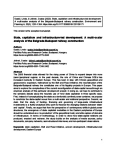 The 2008 financial crisis allowed for the rising power of China to expand deeper into more (semi-)peripheral regions: in the past decade, the role of China and Chinese SOEs has increased markedly in Eastern Europe. This has been in step with China's geopolitical and geoeconomic expansion, hallmarked by the Belt and Road Initiative; the reconstruction of the Belgrade-Budapest railway line constitutes one of its flagship projects in Europe. This paper aims to explore the complexities of the current reconfiguration of state-capital nexus through an empirical analysis of this particular development project; in doing so, we hope to contribute to the scholarly debate about the heuristic use of ‘new’ state capitalism in three specific ways. First, instead of conceptualizing the state as a territorially confined power container, we propose to scrutinize the state-capital nexus from a multi-scalar and relational perspective. Second, we claim that the study of funding, financing and governing of large-scale infrastructural investments is a fruitful analytical entry point to theorize the changing relations between ‘state’ and ‘capital’. Finally, we argue that from the perspective of contemporary shifts in global power structures, the emergence of state capitalist modalities in the Eastern peripheries of Europe should be understood as a ‘co-production’ of the geopolitical rivalry and elite capture of domains of infrastructure. In terms of methodology, in order to show how state-capital relations are produced, enacted and redrawn, the study builds on the analysis of media sources, policy documents, company networks, semi-structured interviews, and non-participant observations.