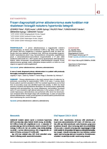 Légrády, Péter and Fejes, Imola and Lázár, György ifj and Palásti, Péter and Turkevi-Nagy, Sándor and Ábrahám, György and Várkonyi, Tamás (2025) Frissen diagnosztizált primer aldosteronismus esete korábban már részletesen kivizsgált rezisztens hypertoniás betegnél : [esetismertetés] = A case of newly diagnosed primary aldosteronism in a patient with previously thoroughly investigated resistant hypertension. HYPERTONIA ÉS NEPHROLOGIA, 29 (1). pp. 43-46. ISSN 1418-477X