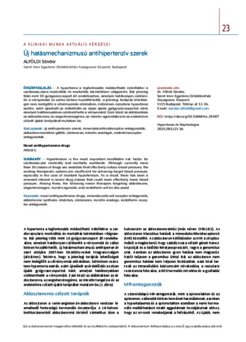 A hypertonia a legfontosabb módosítható rizikófaktor a cardiovascularis morbiditás és mortalitás tekintetében világszerte. Bár jelenleg több mint 10 gyógyszercsoport áll rendelkezésre, amelyek hatékonyan csökkentik a vérnyomást és széles körben hozzáférhetők, a jelenlegi terápiás lehetőségek nem kielégítők a célvérnyomás elérésében, különösen rezisztens hypertonia esetén, ezért újraéledt az érdeklődés az olyan újabb gyógyszercsoportok iránt, amelyek hatékonyabban csökkenthetik a vérnyomást. Ezek közül az alábbiakban az aldoszteronra, az angiotenzinogénre, az inkretin agonistákra és az endotelinre célzott újabb terápiákat mutatom be. | – Hypertension is the most important modifiable risk factor for cardiovascular morbidity and mortality worldwide. Although currently more than 10 classes of drugs are available that effectively reduce blood pressure, the existing therapeutic options are insufficient for achieving target blood pressure, especially in the case of resistant hypertension. As a result, there has been a renewed interest in newer drug classes that could more effectively lower blood pressure. Among these, the following newer therapies targeting aldosterone, angiotensinogen, incretin agonists, and endothelin will be discussed.