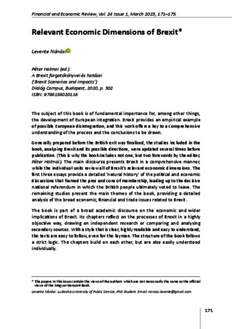 Nánási, Levente Zsolt (2025) Relevant Economic Dimensions of Brexit. FINANCIAL AND ECONOMIC REVIEW, 24 (1). pp. 171-175. ISSN 2415-9271