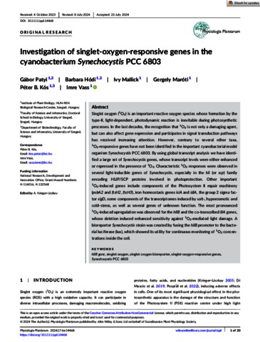 Patyi, Gábor and Hódi, Barbara and Mallick, Ivy and Maróti, Gergely and Kós, Péter and Vass, Imre (2024) Investigation of singlet‐oxygen‐responsive genes in the cyanobacterium Synechocystis PCC 6803. PHYSIOLOGIA PLANTARUM, 176 (4). pp. 1-20. ISSN 0031-9317