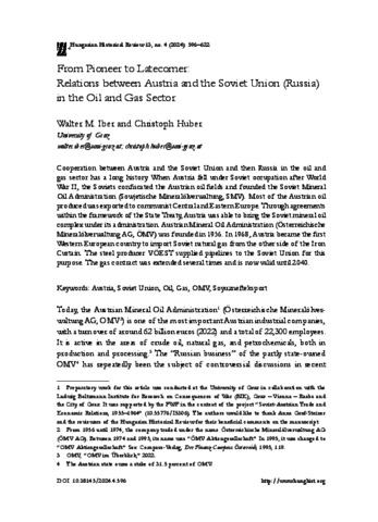 Iber, Walter M. and Huber, Christoph (2025) From Pioneer to Latecomer: Relations between Austria and the Soviet Union (Russia) in the Oil and Gas Sector. HUNGARIAN HISTORICAL REVIEW: NEW SERIES OF ACTA HISTORICA ACADEMIAE SCIENTIARIUM HUNGARICAE, 13 (4). pp. 596-622. ISSN 2063-8647 (print); 2063-9961 (online)