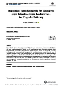 Horváth, László (2024) Hypereides: Verteidigungsrede für Euxenippos gegen Polyeuktos wegen Landesverrats– Zur Frage der Datierung. ACTA ANTIQUA ACADEMIAE SCIENTIARUM HUNGARICAE, 64 (3-4). pp. 365-379. ISSN 0044-5975
