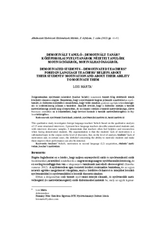 Lois, Márta (2015) Demotivált tanuló - demotivált tanár? Középiskolai nyelvtanárok nézetei tanulóik motivációjáról, motiválhatóságáról = Demotivated students-demotivated teachers? Foreign language teachers' beliefs about their students' motivation and about their ability to motivate them. ALKALMAZOTT NYELVÉSZETI KÖZLEMÉNYEK, 10 (2). pp. 41-52. ISSN 1788-9979