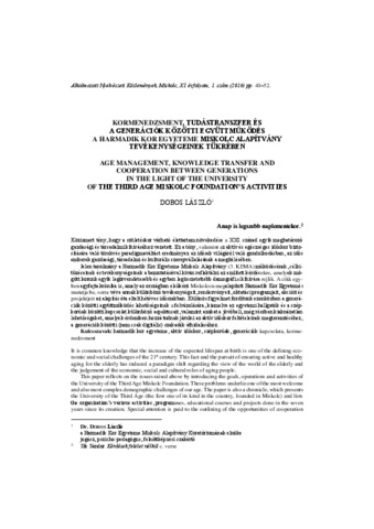Dobos, László (2016) Kormenedzsment, tudástranszfer és a generációk közötti együttműködés a Harmadik Kor Egyeteme Miskolc Alapítvány tevékenységeinek tükrében = Age management, knowledge transfer and cooperation between generations in the light of The University Of The Third Age Miskolc Foundation's activities. ALKALMAZOTT NYELVÉSZETI KÖZLEMÉNYEK, 11 (1). pp. 40-52. ISSN 1788-9979