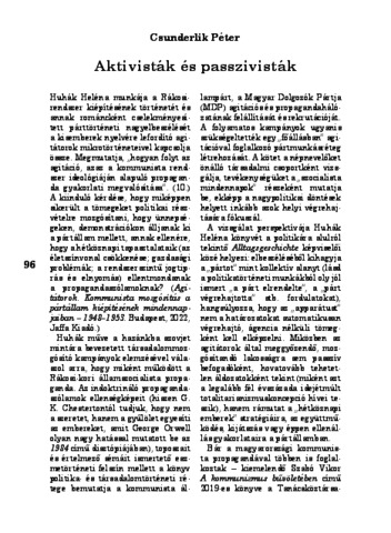 Csunderlik, Péter (2024) Aktivisták és passzivisták (Huhák Heléna: Agitátorok - Kommunista mozgósítás a pártállam kiépítésének mindennapjaiban ). Mozgó Világ. pp. 96-99.