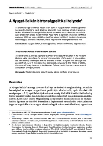 Egeresi, Zoltán and Csáki, Lilla (2025) A Nyugat-Balkán biztonságpolitikai helyzete. NEMZET ÉS BIZTONSÁG: BIZTONSÁGPOLITIKAI SZEMLE, 18 (1). pp. 23-54. ISSN 1789-5286