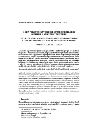 Veresné Valentinyi, Klára (2022) A gépi fordítás és utószerkesztési gyakorlatok beépítése a szakfordítóképzésbe = Incorporating machine translation and post-editing exercise into the technical training programme. ALKALMAZOTT NYELVÉSZETI KÖZLEMÉNYEK, 15 (2). pp. 133-144. ISSN 1788-9979