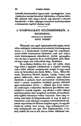 Nagy, József (1860) A gyomoralkati különbségekről a madaraknál : Székfoglaló értekezés [levelező]. Magyar Akadémiai Értesítő. Mathematikai és természettudományi osztályok közlönye, 1 (1). pp. 30-44. ISSN 0200-0539