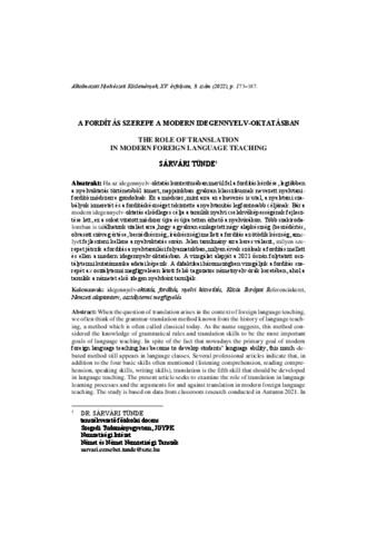 Ha az idegennyelv-oktatás kontextusában merül fel a fordítás kérdése, legtöbben a nyelvoktatás történetéből ismert, napjainkban gyakran klasszikusnak nevezett nyelvtani-fordító módszerre gondolnak. Ez a módszer, mint arra az elnevezés is utal, a nyelvtani sza-bályok ismeretét és a fordításkészséget tekintette a nyelvtanítás legfontosabb céljának. Bár a modern idegennyelv-oktatás elsődleges célja a tanulók nyelvi cselekvőképességének fejlesz-tése lett, ez a sokat vitatott módszer újra és újra tetten érhető a nyelvórákon. Több szakiroda-lomban is találhatunk utalást arra, hogy a gyakran emlegetett négy alapkészség (beszédértés, olvasott szöveg értése, beszédkészség, íráskészség) mellett a fordítás az ötödik készség, ame-lyet fejleszteni kellene a nyelvoktatás során. Jelen tanulmány arra keres választ, milyen sze-repet játszik a fordítás a nyelvtanulási folyamatokban, milyen érvek szólnak a fordítás mellett és ellen a modern idegennyelv-oktatásban. A vizsgálat alapját a 2021 őszén folytatott osz-tálytermi kutatómunka adatai képezik. A didaktikai háromszögben vizsgáljuk a fordítás sze-repét az osztálytermi megfigyelésen látott felső tagozatos németnyelv-órák keretében, ahol a tanulók a németet első idegen nyelvként tanulják.