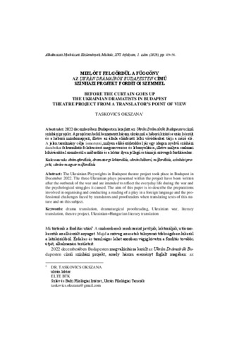 Taskovics, Okszana (2023) Mielőtt felgördül a függöny. Az Ukrán drámaírók Budapesten című színházi projekt fordítói szemmel = Before the curtain goes up the Ukrainian dramatists in Budapest theatre project from a translator's point of view. ALKALMAZOTT NYELVÉSZETI KÖZLEMÉNYEK, 16 (1). pp. 49-56. ISSN 1788-9979