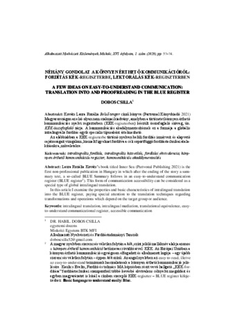 Dobos, Csilla (2023) Néhány gondolat a könnyen érthető kommunikációról : Fordítás KÉK-regiszterbe, lektorálás KÉK-regiszterben =A few ideas on easy-to-understand communication : translation into and proofreading in the Blue register. ALKALMAZOTT NYELVÉSZETI KÖZLEMÉNYEK, 16 (1). pp. 57-74. ISSN 1788-9979