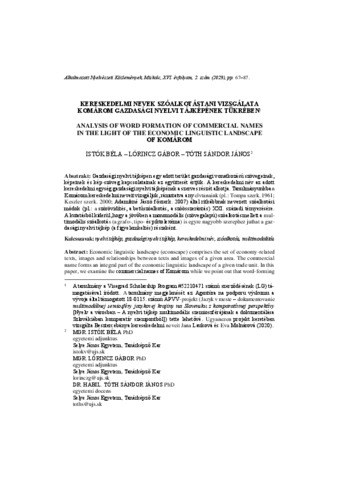 Istók, Béla and Lőrincz, Gábor and Tóth, Sándor János (2023) Kereskedelmi nevek szóalkotástani vizsgálata Komárom gazdasági nyelvi tájképének tükrében = Analisys of word formation of commercial names in the light of the economic linguistic landscape of Komárom. ALKALMAZOTT NYELVÉSZETI KÖZLEMÉNYEK, 16 (2). pp. 67-87. ISSN 1788-9979