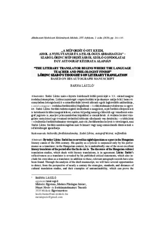 Barna, László (2023) "A műfordító ott kezdi, ahol a nyelvtanár és a filológus abbahagyja" – Szabó Lőrinc műfordításról szóló gondolatai egy autográf kézirata alapján = "The literary translator begins where the language teacher and philologist finish" - Lőrinc Szabó's thoughts on literary translation based his autograph manuscript. ALKALMAZOTT NYELVÉSZETI KÖZLEMÉNYEK, 16 (2). pp. 164-185. ISSN 1788-9979