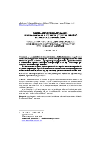Dobos, Csilla (2024) Fordítás magyarról magyarra – Néhány gondolat a gyerekek nyelvére történő intralingvális fordításról = Translation from hungarian to hungarian : some thoughts on intralingual translation into children's language. ALKALMAZOTT NYELVÉSZETI KÖZLEMÉNYEK, 17 (2). pp. 48-67. ISSN 1788-9979
