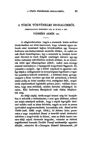 Vámbéry, Ármin (1861) A török történelmi irodalomról : Székfoglaló értekezés [levelező]. Magyar akademiai értesítő. A Nyelv- és Széptudományi Osztály közlönye, 2 (1). pp. 87-107. ISSN 0200-0555