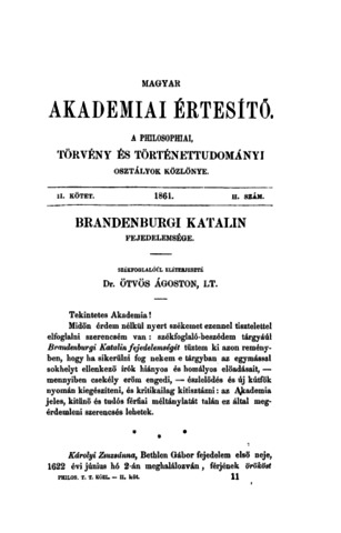 Ötvös, Ágoston (1861) Brandenburgi Katalin fejedelemsége : Székfoglaló értekezés [levelező]. Magyar akademiai értesítő. A philosophiai, törvény- és történettudományi osztályok közlönye, 2 (2). pp. 153-244. ISSN 0200-0547