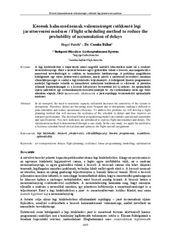 A légi közlekedésben a kapacitások minél nagyobb mértékű kihasználása miatt nő a rendszer zavarérzékenysége. Ezért a zavarok hatására egyre gyakoribbá válnak a késések, ami megnehezíti a menetrend tervezhetőségét és csökken az üzemeltetés hatékonysága. A probléma megoldására kidolgozunk egy olyan járattervezési módszert, amely növeli a menetrend késésekkel szembeni ellenállóképességét és ezáltal a légi közlekedés teljesítményét. A kidolgozott lineáris programozási modellel figyelembe vehetők az üzemeltetést szabályozó korlátozások és előírások. A járatokra jellemző bizonytalanságok és a késések kifejezésére bevezettünk két új indexet. Az optimalizáló eljárás működését egy esettanulmányon keresztül mutatjuk be. Az esettanulmány során egy valós adatokon alapuló, fiktív menetrendre alkalmazzuk a járat-repülőgép összerendelést optimalizáló módszert. | In air transport, the need to maximise capacity utilisation increases the sensitivity of the system to disruptions. Therefore, delays are becoming more frequent due to disruptions, making it difficult to plan timetables and reduce operational efficiency. To address this problem, we will develop a flight planning method that will increase the resilience of the schedule to delays and thus improve air transport performance. The developed linear programming model can consider operational constraints and specifications. Two new indicators are introduced to express flight uncertainties and delays. The optimisation method is demonstrated through a case study. In the case study, we apply the method to a fictitious schedule based on real data and optimise the flight-aircraft assignment.