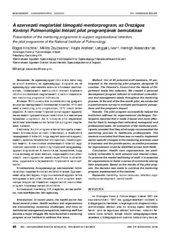 Bevezetés Az egészségügyet több krízis rázta meg az elmúlt években, az egészségügyi dolgozók és az egészségügyi szervezetek számos kihívással szembesülnek, intézetvezetői szempontból kiemelt küzdelem indult a munkatársak megtartásáért. E célból intézetünkben mentorálási folyamatot indítottunk.Módszer 85 fő potenciális munkatársból igazgatói tanácsi és részlegvezetői kiválasztást követően 14 fő vett részt a mentorálás pilot programban, 13 szakember társaságában. A mentorálásban egyéni egyeztetés és vezetői igények alapján alakítottuk ki a személyes fejlesztési programot. Az öt hónapos pilot végeztével kérdőíves lekérdezés során felmértük a program megítélését, hatásait.Eredmény A pilot program sikerrel támogatta a szervezeti kihívásokban érintett intézményt, a résztvevők összegzéséből kiderült, hogy segített számukra egyéni, vezetői, szakmai feladataikat könnyebben, hatékonyabban kezelni.Következtetés Az egészségügyi szervezetek hatványozottan megviselik a külső és belső kríziseket. Egy szervezet célja kell legyen, hogy munkatársait egyben tartva támogassa a lelki jóllét irányába. Éppen ezért az intézetben megvalósított mentorálása program folytatása mellett döntöttünk. | Introduction: In recent years, the health sector has faced several crises. Health workers and organisations are encountering numerous challenges, and from an institutional management perspective, retaining staff has become a major struggle. We have launched a mentoring program at our Institute to address this issue. Method: Out of 85 potential staff members, 14 par - ticipated in the mentoring pilot program alongside 13 coaches. The Director's Council and the Heads of De - partment made this selection. We created a personal development program tailored to individual consultations and management needs throughout the mentoring process. At the end of the five-month pilot, we conducted a questionnaire survey to evaluate participants' perceptions and the program's impact. Results: The pilot program successfully helped the institution address its organisational challenges. Par - ticipants reported that it made it easier and more effective for them to manage their individual, managerial, and professional tasks. An evaluation of the mentored participants revealed that they all strongly recommended the mentoring process to healthcare professionals. The mentors concluded that there was no need to implement sector-specific changes to the mentoring practices used in business and the private sector, as similar processes for improvement could be identified across both fields. Conclusion: Health care organisations are parti - cularly vulnerable to both external and internal crises. To promote the mental well-being of staff, it is essential for organisations to foster a sense of community among their employees. Based on the results of the pilot program, the decision was made to continue the mentoring program implemented at the Institute.
