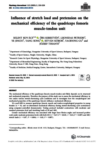 Kovács, Bálint and Sebestyén, Örs and Petridis, Leonidas and Ye, Jingyi and Song, Yang and Kóbor, István and Gu, Yaodong and Tihanyi, József (2025) Influence of stretch load and pretension on the mechanical efficiency of the quadriceps femoris muscle-tendon unit. PHYSIOLOGY INTERNATIONAL, 112 (2). pp. 210-224. ISSN 2498-602X